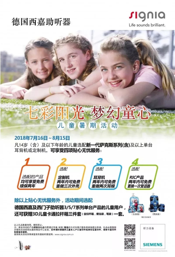 孩子是祖国的未来,是美好的希望,为答谢儿童用户,倡导关爱儿童听力健康的理念,公司特别奉献 2018 德国西嘉及西门子助听器“七彩阳光 梦幻童心”儿童暑期活动,让孩子沐浴七彩阳光,保留纯真梦幻童心!