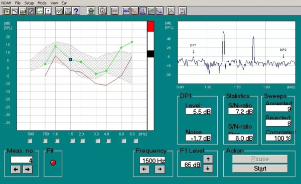 DPOAE具有频率特异性,若所有频率的信噪比均大于3dB,则可判断该受试耳的耳蜗功能基本正常。若有个别点信噪比小于3dB,则应根据测试设备及厂商的要求判断是否测试通过。
