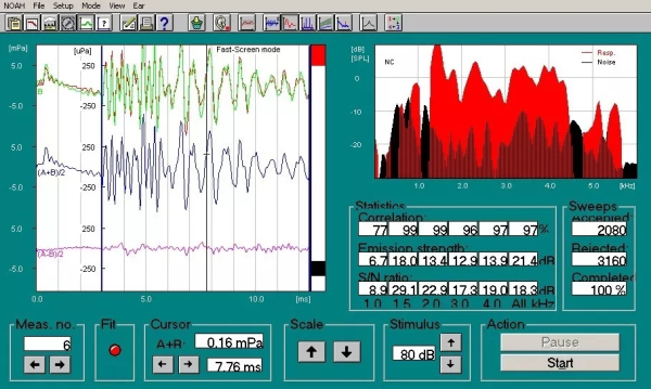 由一个瞬态声诱发的耳声发射称为TEOAE,主要用于筛查。判断TEOAE是否引出耳声发射的标准会比OPOAE多。